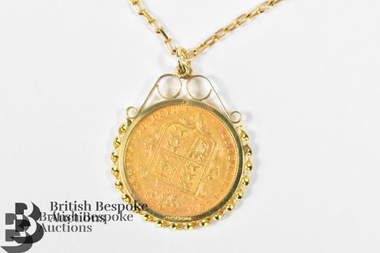 Victorian 1884 Shield Back half sovereign, in a 9ct gold mount, on a 9ct gold chain, approx 7.38 gms.