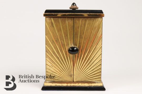Art Deco Cartier miniature carriage clock. The clock having a gilded case with cabochon winder, having a white enamel engine-turned face with Roman dial to both face and shutters, approx 58 x 40 x 28 mm, stamped Cartier to verso nr 00188.