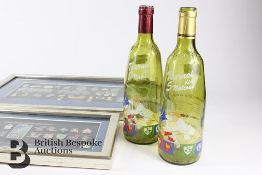 Two frames of World Cup Rugby pin badges; the first being a count down to the 2003 opening ceremony with several other 2003 World Cup Rugby badges, 42 in total. The other frame being limited edition Rugby World Cup 2003 World In Union, Participating Union Commemorative Pin Set no. 0003/2500, 20 pins. Together with 2 empty bottles from 1990 Tournoi Des 5 Nations Vin de Pays de la cite de Carcassonne, decorated with figures playing rugby and match dates.