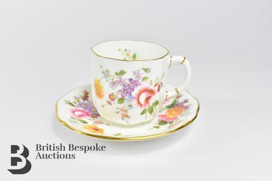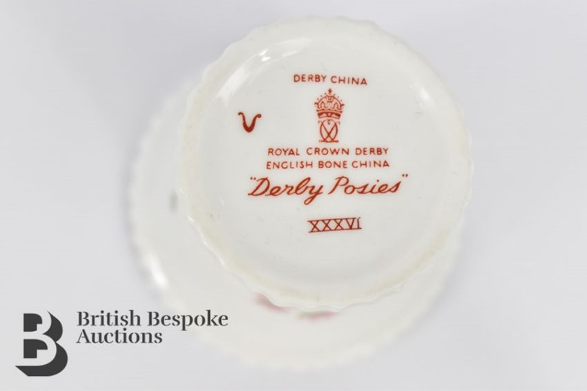 Royal Crown Derby comport, in the Derby Posies pattern, approx  27 cms x 8 h cms, together with four Derby Posies demi-tasse cups and saucers, toothpick holder and a posy vase approx 12 cms h.