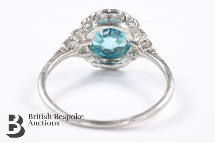 Blue Zircon and diamond ring. The radiant zircon of approx 2.5 cts is surrounded by baguette and round-cut dias of 0.44 cts, platinum mount, size M, approx 2.8 gms.Note: some evidence of resizing.