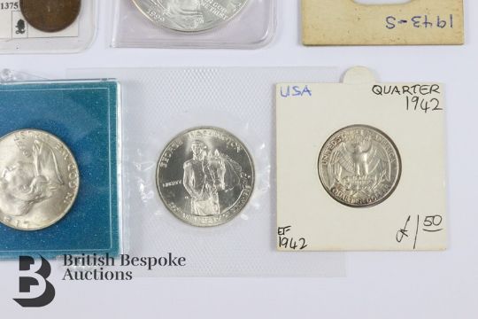 Miscellaneous silver dollar coins. This lot includes 2 x US silver one dollar (1999,2005) a US silver dollar (1921) and uncirculated 1982 George Washington commemorative US silver half dollar and 1964 Kennedy Liberty silver half dollar and 1963 Franklin Liberty silver half dollar, 1972 uncirculated Eisenhower silver dollar, 1998 Bermuda Triangle 1 dollar, 1943 Liberty dime, 1942 Liberty quarter dollar, 1942 Liberty one cent and 1999 Liberty quarter dollar.