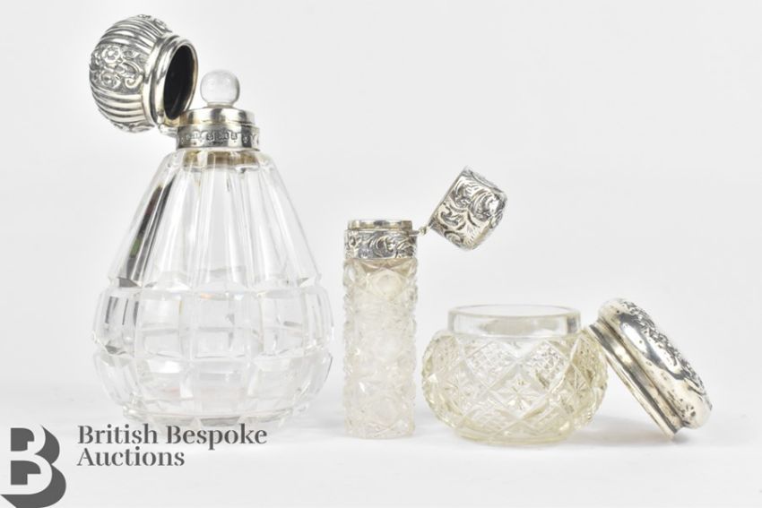 Two silver topped scent bottles, one silver topped vanity pot and silver plated sugar bowl and spoon. The first scent bottle with glass stopper, mm J.G&S (John Grinsell & Sons) Birmingham 1900 measures 12cms, the second measures 8cm mm WSM London, and the vanity pot measuring 5cms mm MJJ (Matthew John Jessop) Birmingham 1900. Together with a silver plated sugar bowl with blue glass liner rdno. 421101 and silver plate spoon.