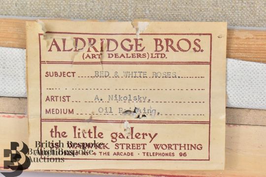 Athanasius Nikolsky (active 1950-1980) oil on canvas, entitled 'Red and White Roses', approx 60w x 50 h, signed lower right dated 1964.