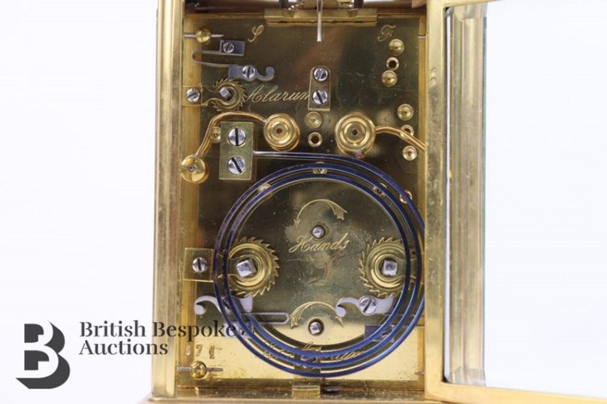 19th century gilt brass carriage clock, 8 day movement, repeater, white enamel face with roman dial and alarm, complete with key and burgundy case. approx 9 x 8 x 13.5 cms.