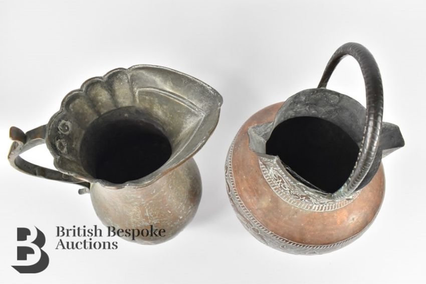 Continental 19th century copper water vessel, incised with an interesting foliate design, twin spout with wrought metal handle, approx 42 cms h together with a Mughal example with segmented rim and elongated spout, incised arabesque decoration wrought metal handle approx 30 cms h. (2)