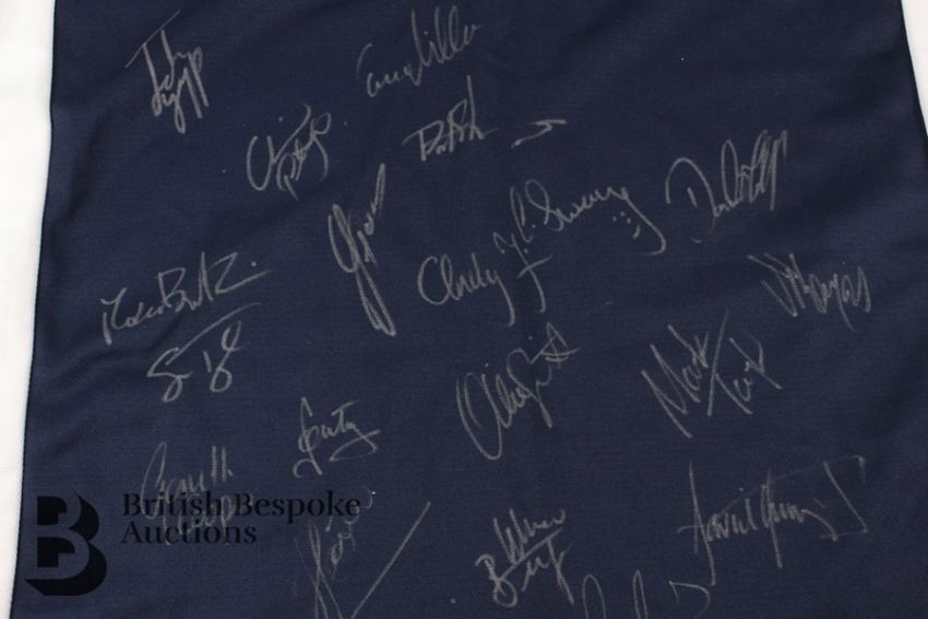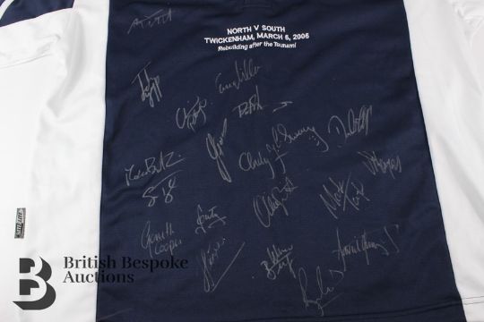 Signed rugby shirt from Rugby Aid Northern VS Southern Hemisphere to raise money for the 2004 Tsunami, Rebuilding after the Tsunami, Twickenham, 5th March 2005. Signed by 20/23 of the Northern Squad; John Yapp, Andy Titterrell, Chris Horsman, Marco Bortolami, Donncha O'Callaghan, Lawrence Dallaglio (c), Pat Sanderson, Simon Taylor, Gareth Cooper, David Humphreys, Ben Cohen, Ceri Sweeney, Ollie Smith, Mirco Bergamasco, Chris Paterson, Raphael Ibanez, Cedric Soulette, Eric Miller, Jonathan Thomas, Mike Phillips, Mark Taylor, Mathew Tait, Clive Woodward. Autographs signed in silver marker on navy blue kit, size 3XL.