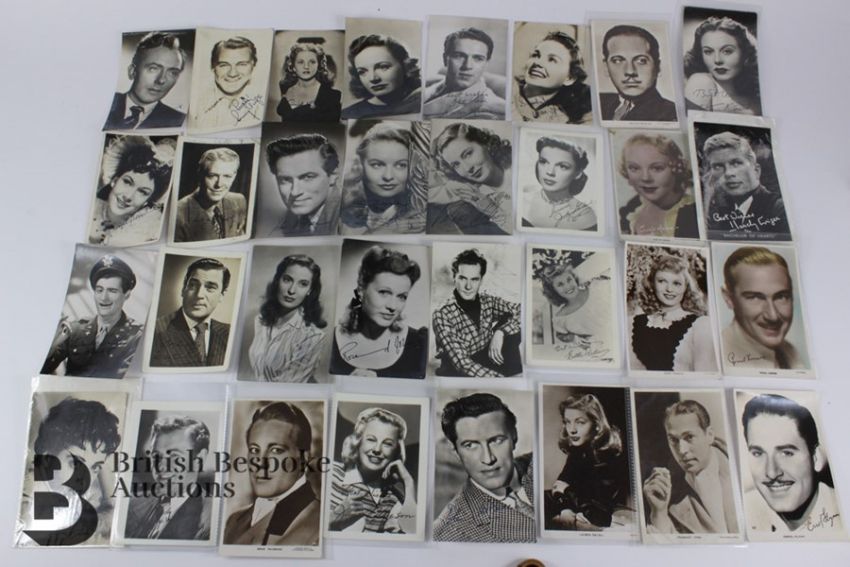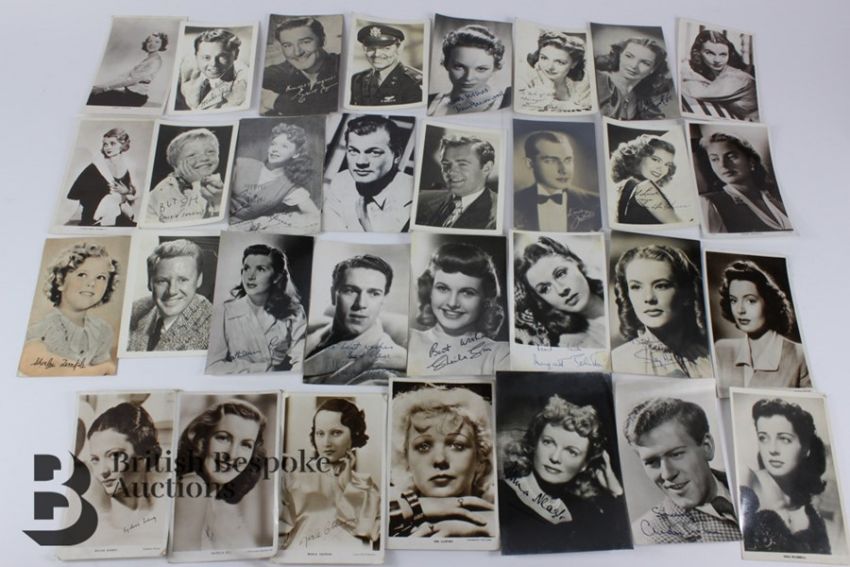 Approx. 300 vintage film star postcards, mostly real photographic with many bearing printed signatures, including; John Mills, Richard Attenborough, Deanna Durbin, Margaret Lockwood, Patricia Roc, Clark Gable, Marlene Dietrich, Elizabeth Taylor, Ronald Reagan, Lana Turner, Errol Flynn, Walter Pidgeon, John Wayne, Shirley Temple, Bob Hope, Michael Wilding, Flora Robson, Hazel Court, Jean Simmons, etc. Postcards from Blue Bird stockings, Picturegoer, Warner Bros, Film-Kurier collection, Vanguard Studios, Valentine's.