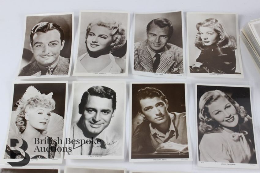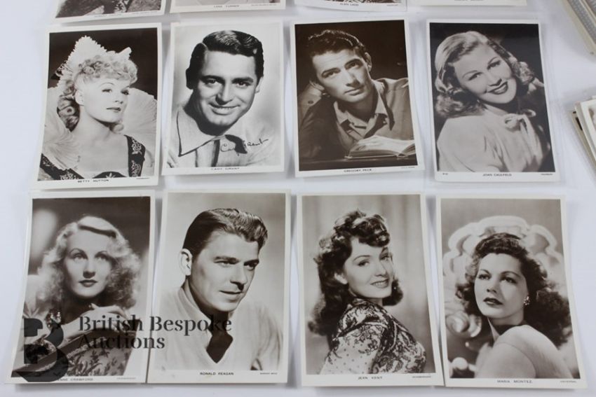 Approx. 100 real photographic postcards of vintage film stars, including; Ronald Reagan, Jean Kent, Gregory Peck, Cary Grant, Betty Hutton, Lauren Bacall, Alan Ladd, Lana Turner, Robert Taylor, Tyrone Power, Debbie Reynolds, Errol Flynn, Ben Cooper, Gene Autry, Norma Shearer, Helen Twelvetrees, Evelyn Laye, etc. All in very good, clean condition, many published by Picturegoer.