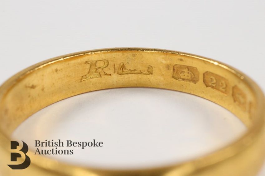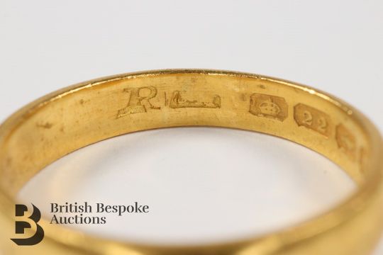22ct gold wedding band, Birmingham hallmark, dated 1916, mm rubbed, size U, approx 5 gms.