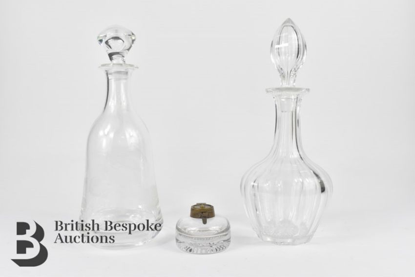 Two cut glass decanters, one Darlington with etched peacock design measuring 31cms, the other measuring 31.5cms, together with a cut glass ink well with brass top.