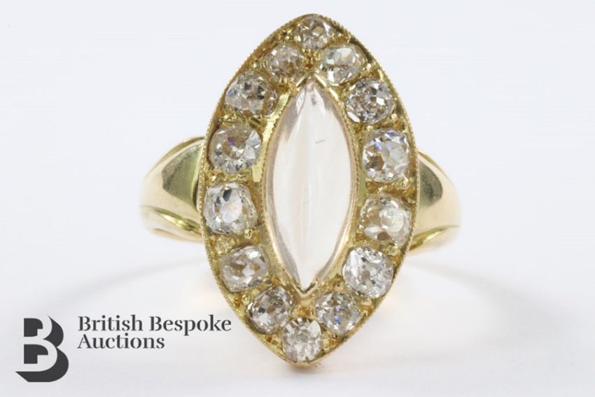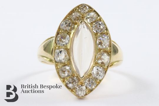 Delicate moonstone and diamond ring, set with a marquise-cut moonstone approx 12 x 5 mm, surrounded by 1.20 cts of dias, size N, approx 5.3 gms.