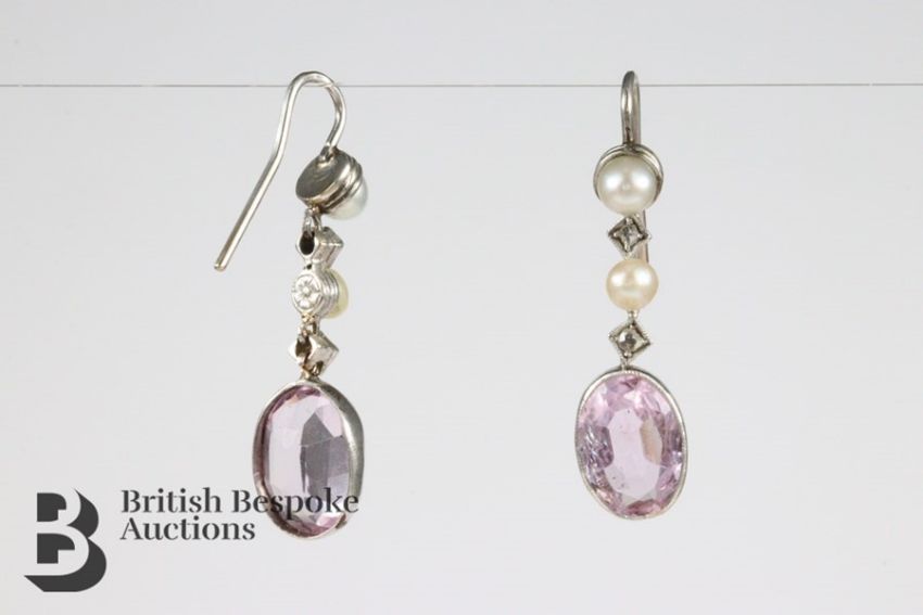Pair white gold pearl and lilac tourmaline earrings. The tourmalines each measure 10 x 8 mm approx 3.66 cts, the drop is 30 mm, 3.38 gms.