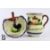 Two pieces of Devon Motto ware, including a Watcombe pottery milk jug and a preserves dish with thumb-pinched decoration and painted with a cockerel. The jug measures 14 cms h and a the olive dish approx 13.5 x 11.5 cms. (af)Note: small vertical crack across preserves, a couple of nibbles to the base rim of the milk jug.