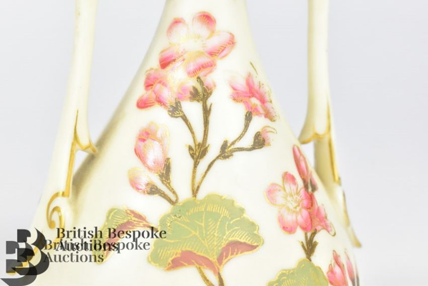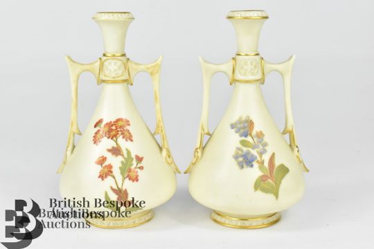 Pair of Royal Worcester twin handled blush ivory vases, circa 1890, finely painted with flowers, puce factory marks, nr 1021 approx 15 cms h.