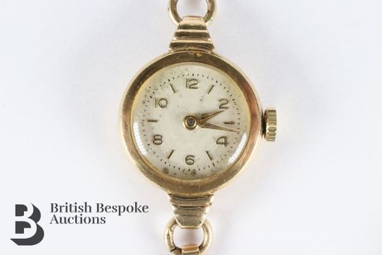 Lady's 9ct gold cocktail wrist watch. The watch having a white face with gold numeric and baton dial, case nr 228496. The watch face measures 15mm, the weight without movement is 8.46 gms.Note: face is slight discoloured, watch moving forward at time of cataloguing.