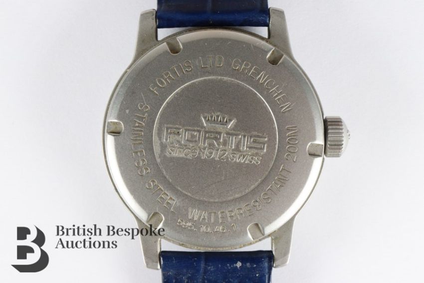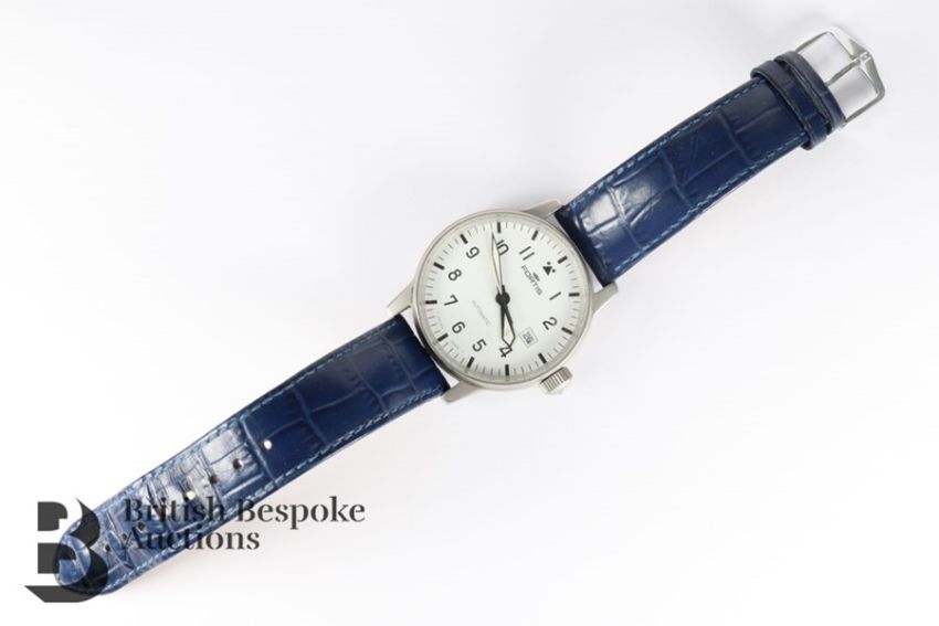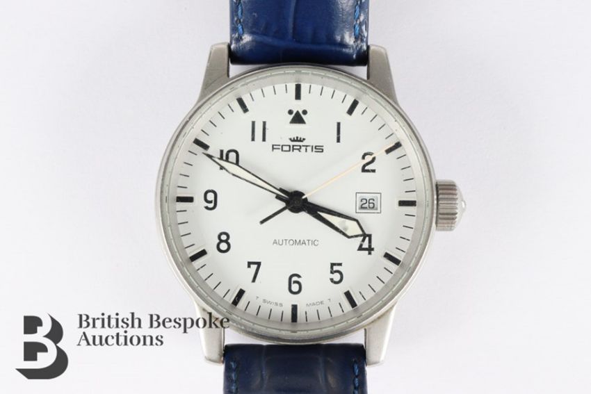 Gentleman's Fortis stainless steel wrist watch. The watch a white face with numeric and baton dial and date aperture, on a Hirsch blue leather strap. Note: this watch is changing it's date.