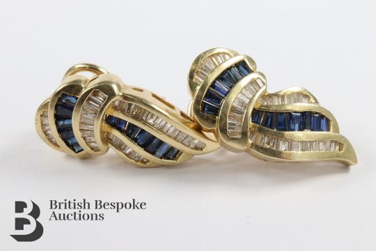 Pair of 14ct yellow gold sapphire and diamond earrings, approx 26 x 12 mm, set with 26 midnight blue baguette-cut sapphires and 90 pts of baguette-cut diamonds, approx 10.73 gms.