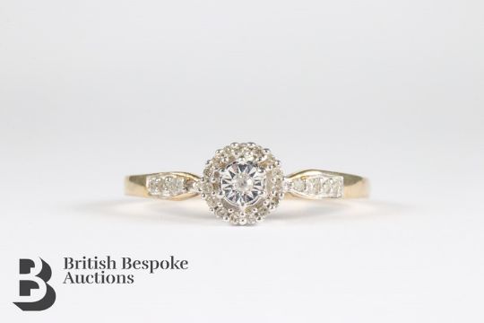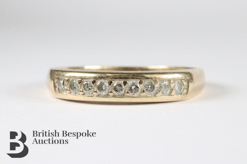 9ct yellow gold half eternity ring, set with 14 pts of dias, size O together with another 9ct gold diamond ring set with approx 12 pts of dias, combined weight of 3.62 gms.