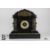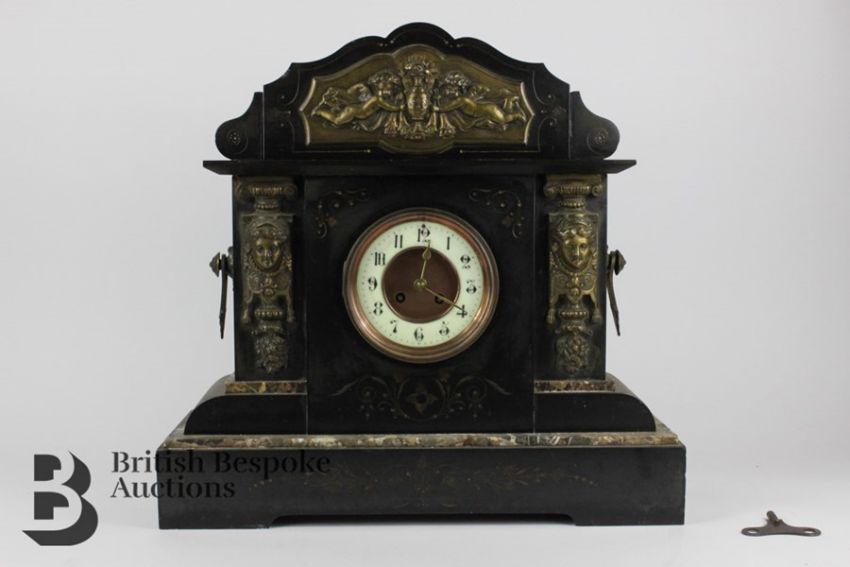 Large Victorian slate and marble clock, with classical cherub and urn surmount, Grecian mask heads and garland decoration to columns, twin handles, in working order complete with key, approx 48w x 50 h x 16.5 cms.