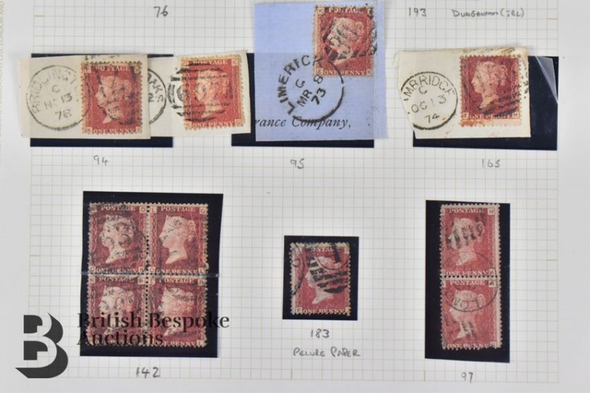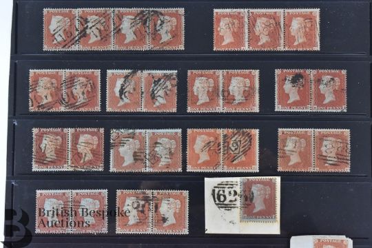 GB 1854 and 1864 1d Reds. This lot comprises firstly 11 pairs (including one on dated piece), a strip of 3, a strip of 4, two other dated pieces with singles plus another single stamp all being used 1854 1d reds of the first officially perforated issue, attractive. Also, GB 1864 1d reds from the plate number series on 2 album leaves including a block of 4; strips of 4 and 3; 5 pairs and 4 dates pieces.