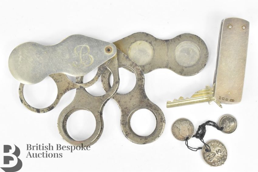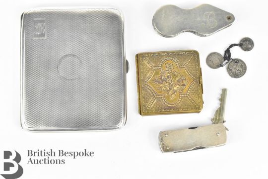 Miscellaneous items, including a silver pocket knife with blade, nail file and key, Birmingham hallmark, dated 1940, together with a vintage pocket ring sizer, monogrammed with a B and a gilded Alexandra pocket needle case by Richard B Turner Redditch and three silver maundy coins dated 1834 1d, 1800 2d and 1896 3d on a string together with a silver cigarette case, Birmingham hallmark, dated 1932, mm WB, engine turned approx 85 x 100 mm.