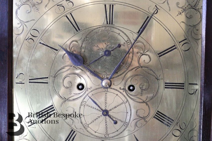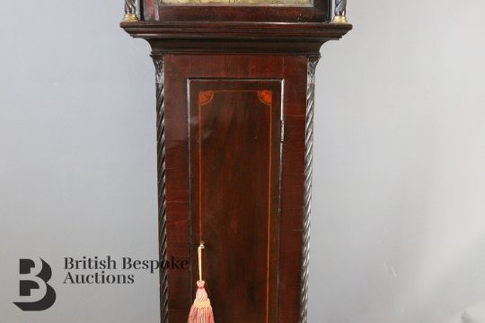 Scottish George III stained mahogany longcase clock, by Alexander Mitchel, Gorbals, brass dial with Roman dial second and date hands, trunk door flanked by twisted rope columns with shell motif, approx 45 w x 25 d x 200 h cms.