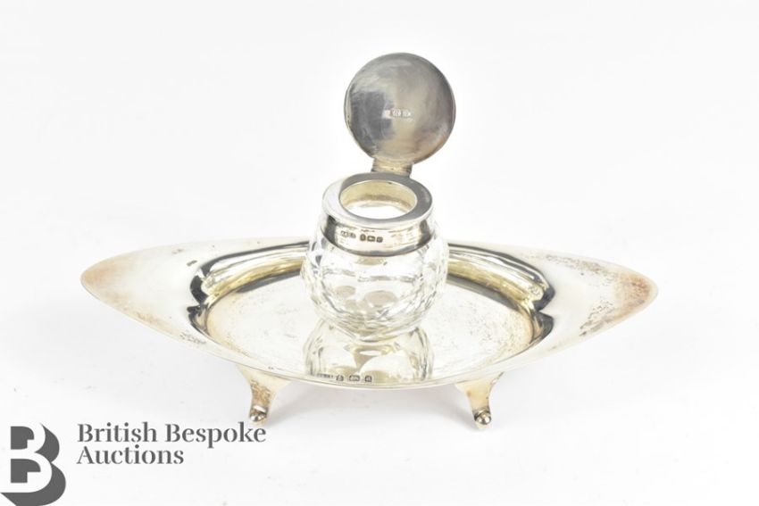 Miscellaneous silver, including a silver inkwell, Birmingham hallmark, dated 1903, mm A.J Zimmerman Ltd. The boat shaped inkwell on four feet holds a crystal and silver topped inkwell approx 18 x 7 cms; together with a cut glass and silver collared scent bottle, two cut glass and silver collared salts, a miniature silver collared stem vase and a small circular silver photo frame approx 9 x 9 cms.Note: The scent bottles stopper is stuck fast.