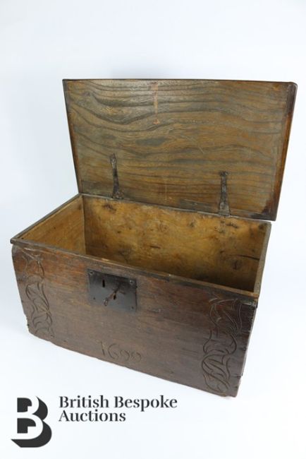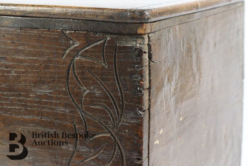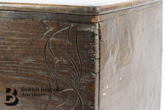 17th/18th century bible box, with the original rear hinges, approx 57 x 33 x 31 cms.