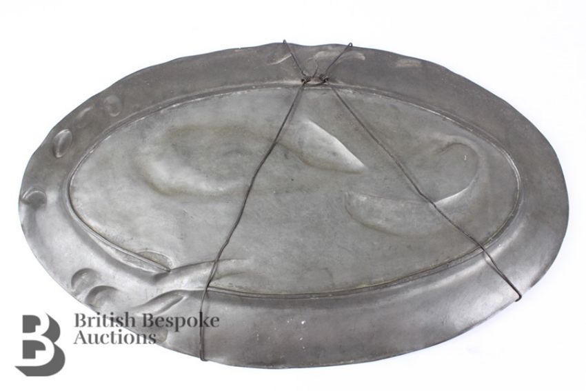 Early 20th century oval pewter platter, depicting fish and lobster caught in a fishing net, approx 52 x 32 cms.