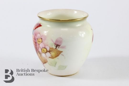 Royal Worcester posy vase,  with gilded flared rim, finely painted with berry, leaf and dog roses, signed Miller, nr 2491, approx 7.2 cms h.