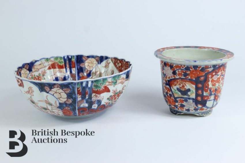 Japanese Satsuma bowl, painted in the typical palette, depicting flowers and birds having a fluted rim together with a Satsuma jardinière approx 12 cms h.