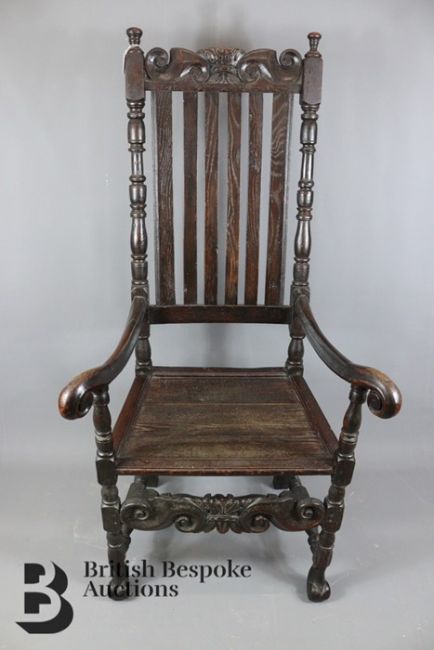 18th century stained oak carver. The large chair having turned legs and stretchers with a decorative apron and swept arm rests, approx 134 cms h.
