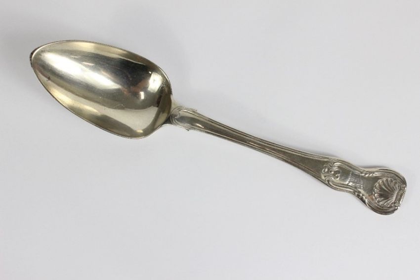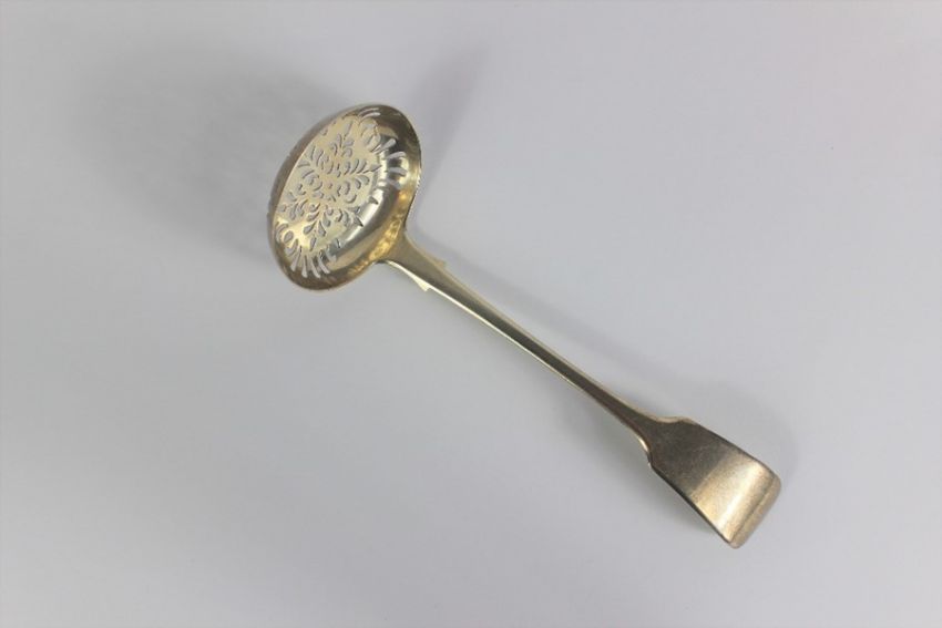George III Irish spoon and fork, Dublin hallmark, dated 1817, mm Barber, Cattle & North, approx 184.5 gms, Georgian rat-tail dessert spoon London hallmark dated 1717, a William IV ladle, York hallmark, dated 1830, mm Barber, Cattle & North, Hanoverian rat tail miniature snuff spoon, London hallmark dated 1725, silver sugar sifter spoon Newcastle hallmark dated 1841 mm John Stone, gross weight approx 337.3 gms.