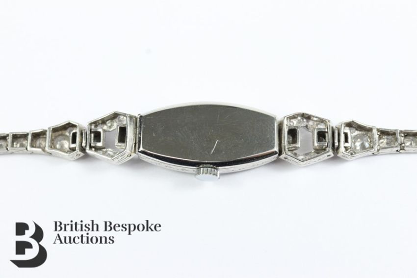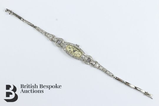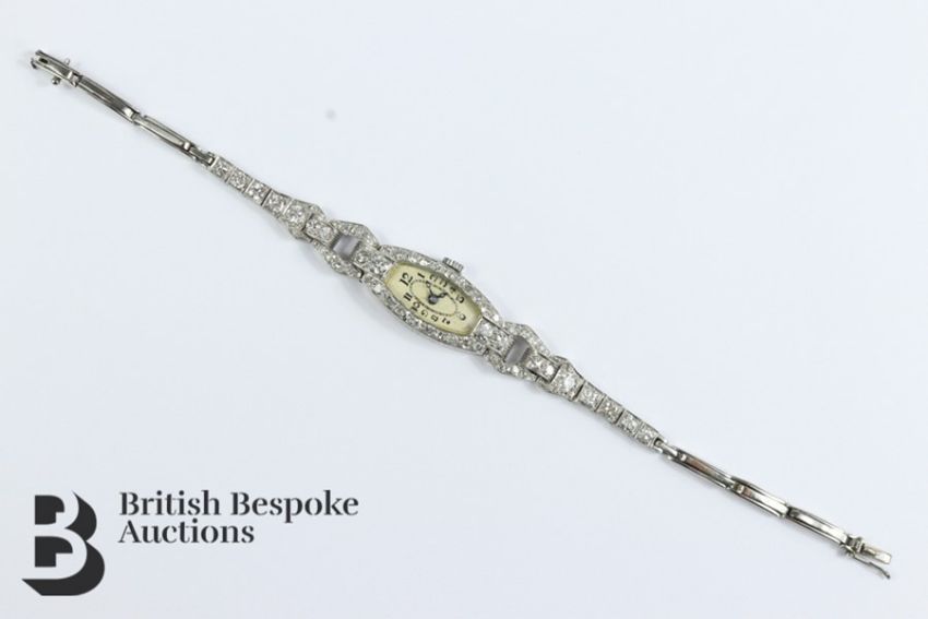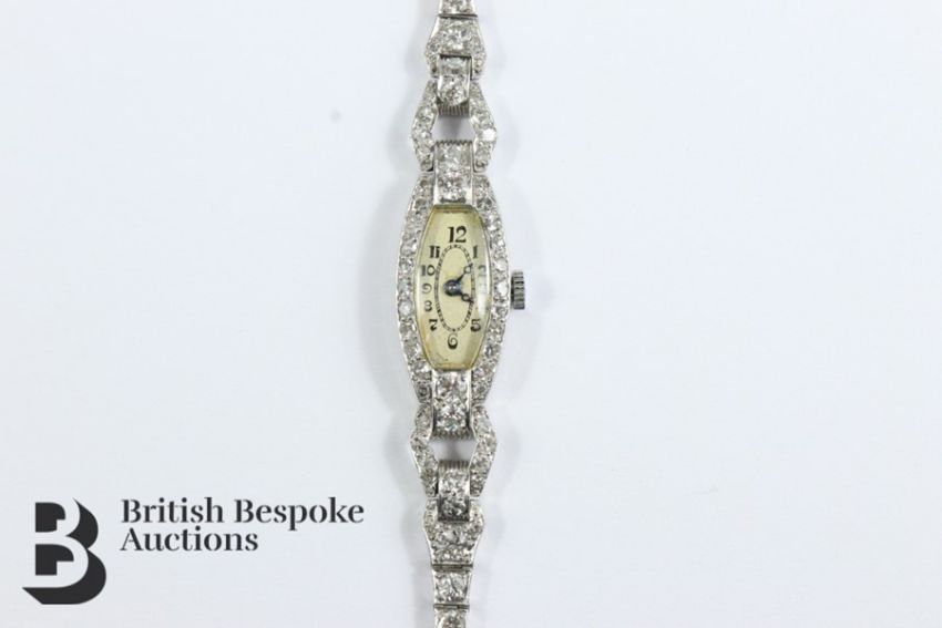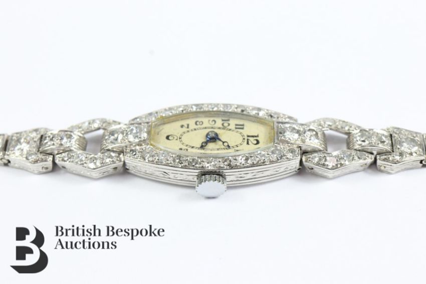 Art Deco platinum and diamond cocktail watch bracelet. The watch having a champagne face with numeric dial, set with approx 2.5cts of dias, movement stamped PWC, approx 17.5 gms, in the original presentation box.