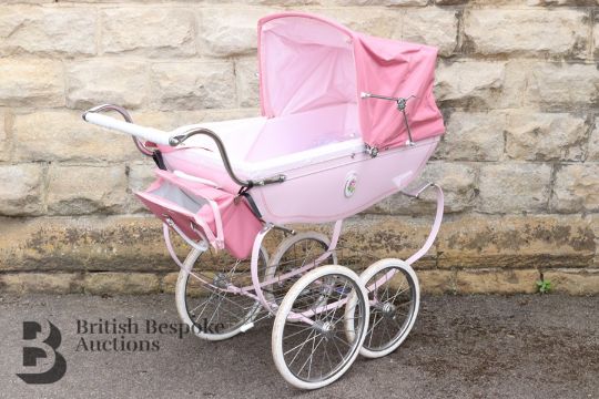 1950's Rolls Royce Silver Cross dolls pram, complete with accessory bag, all in matching pink, in very attractive condition.