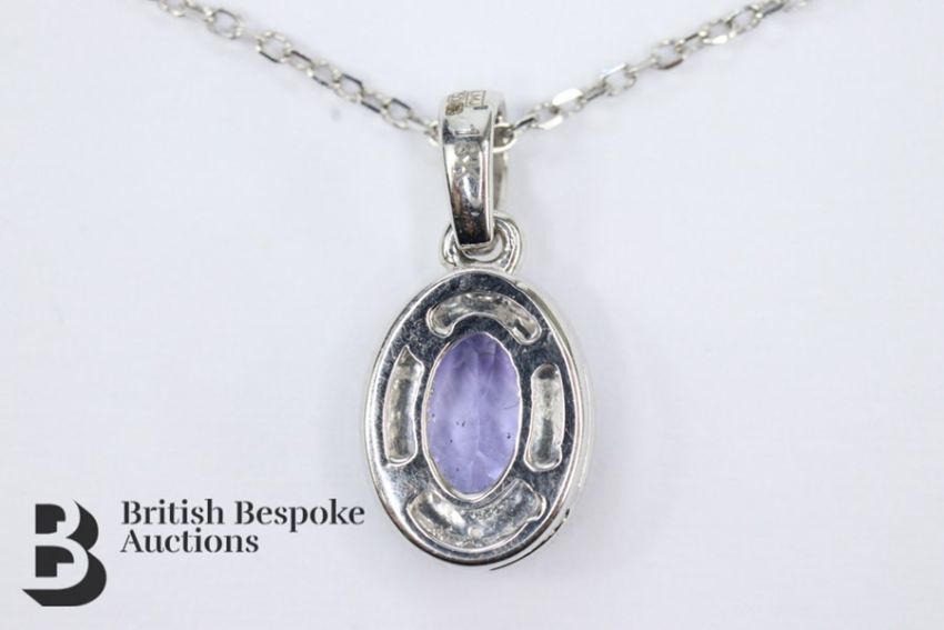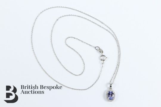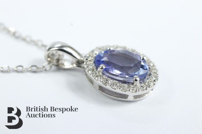 18k white gold Tanzanite and diamond pendant, set with approx 90 pts of dias, suspended on a 18k white gold chain approx 44 cms in length, approx 2.27 gms.