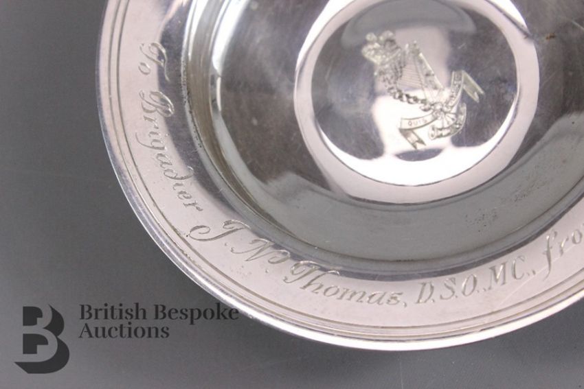 Silver commemorative pin dish, inscribed 'To Brigadier J.W Thomas D.S.O M.c from 1st Battalion The Royal Ulster Rifles (83rd and 86th), approx 10 x 2 cms, London hallmark dated 1962, mm Wakely & Wheeler, approx 93.4 gms.