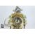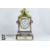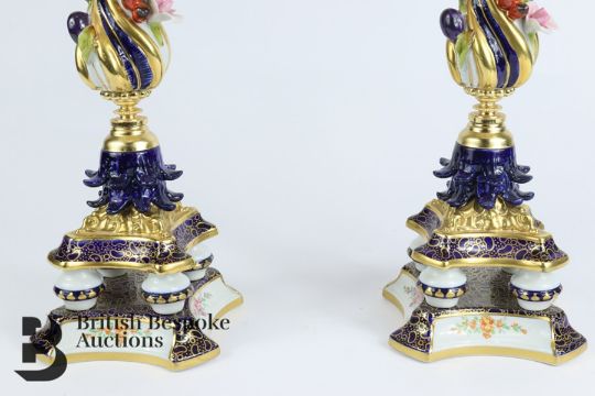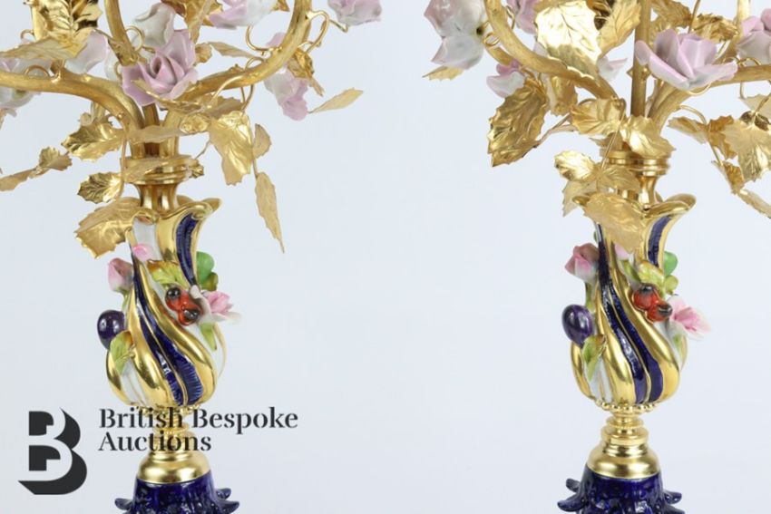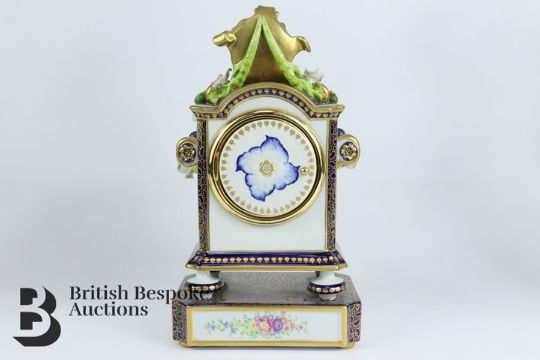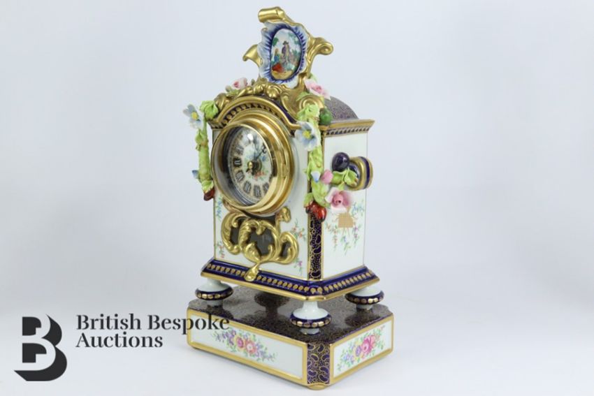 Giulia Mangani porcelain clock and garniture. The clock having applied roses, hops and berry in relief, white enamel face with Roman dial approx 15 w x 30 h cms. Clock garniture is a pair of four branch candelabra, with roses in relief with hand painted floral vignette, approx 45 cms h.