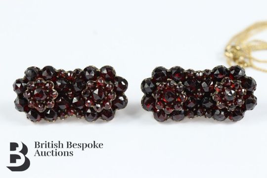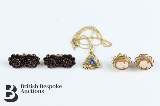 9ct yellow gold Tanzanite pendant, suspended on a 9ct gold chain, with a pair of 9ct cameo earrings and antique garnet earrings on 9ct posts, approx 7 gms for the earrings and pendant, approx 40 cms in length.