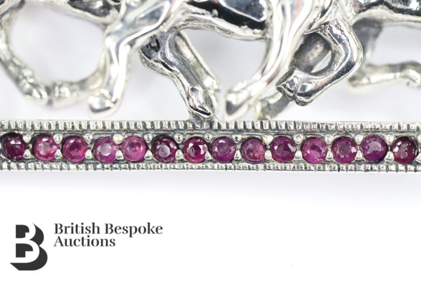 Silver horse brooch, raised on a platform set with rubies, approx 40 mm, approx 9.78 gms.