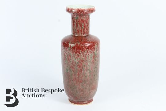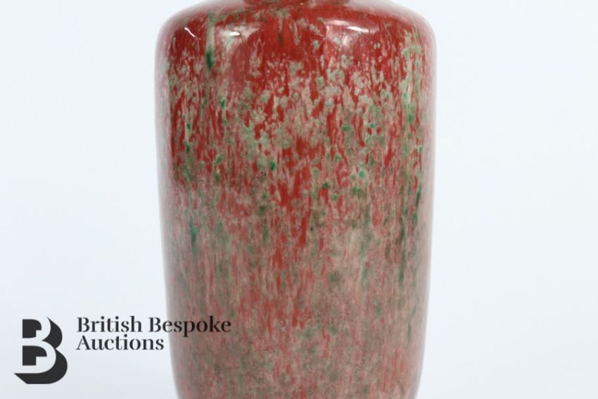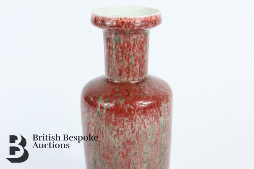 20th century Chinese vase, with a mottled green and pink glaze, approx 26 cms h, with double circle to the base.