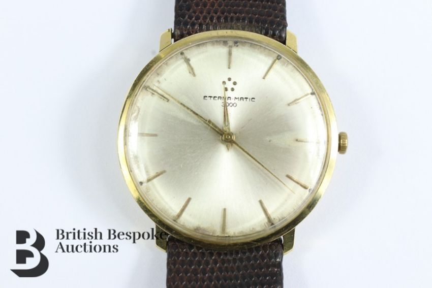 Gentleman's 18ct gold Eternamatic 3000 wrist watch. The watch having a silvered face 32 mm with baton dial, 21 rubies Brevete movement, nr 1456U, approx 30 gms (with movement).Condition report: watch moving forward at time of testing however no guarantees are given. The watch has some scratches to the case and case opening (see images), the face shows signs of discolouration to the edges.