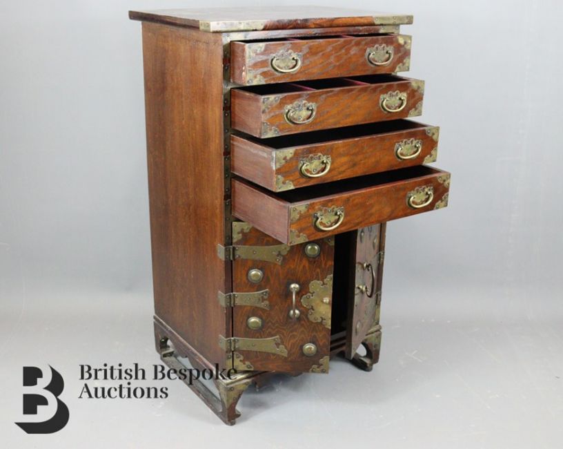 Chinese cabinet, with double cupboard beneath four drawers, attractive brass brackets, lock plate and handles, approx 54 w x 40 d x 95 h cms.