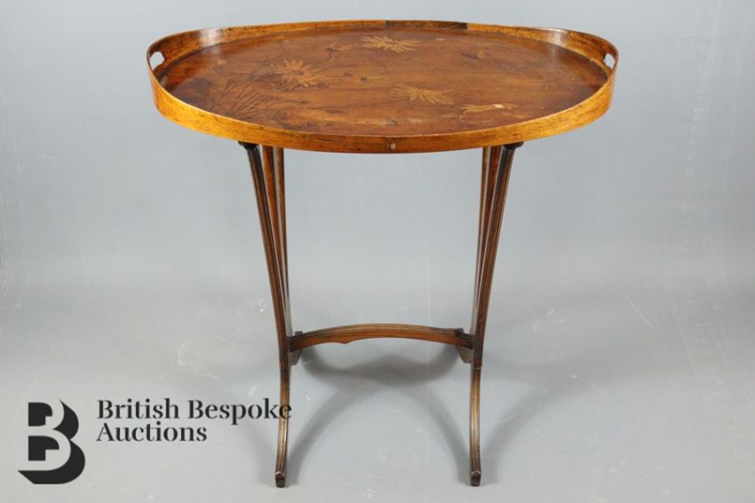 Émile Gallé oval table, with decorative inlay, with twin looped handles, raised on swept feet, approx 75 x 72 x 45 cms. Condition report: The inscription and signature is slightly faded, the table has some damage conducive with age.