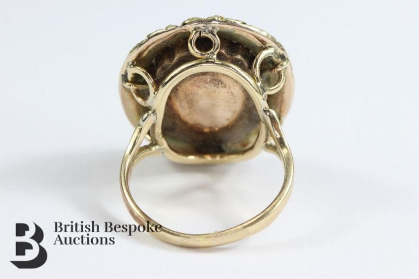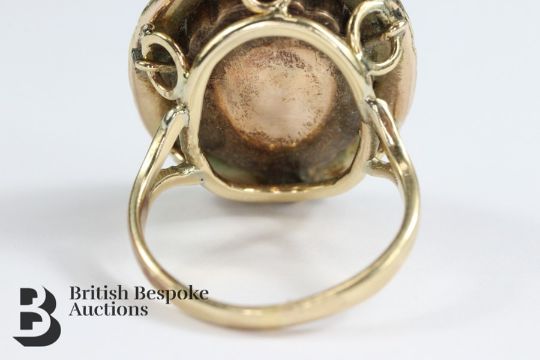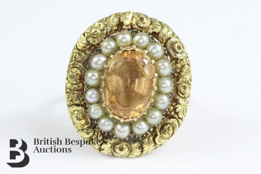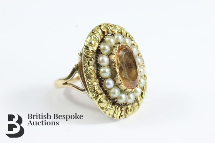 Victorian 14/15ct (tested) yellow gold topaz and pearl dress ring, size M, approx 10.87 gms. The ring set with an oval-cut topaz approx 12 x 8 mm, framed with pearls approx 2mm each in a floral mount.