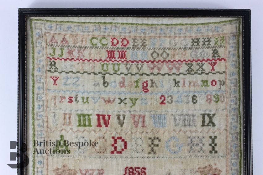 19th century sampler, worked by Maggie Phillips aged 12, dated 1856 approx 33.5 x 41 cms, framed and glazed. Condition report: good bright colour but general brown staining to the linen.