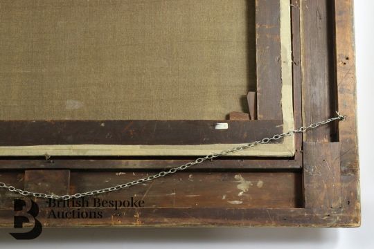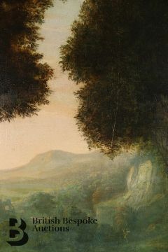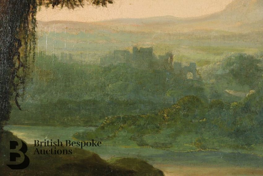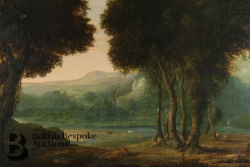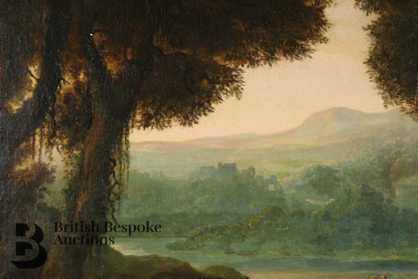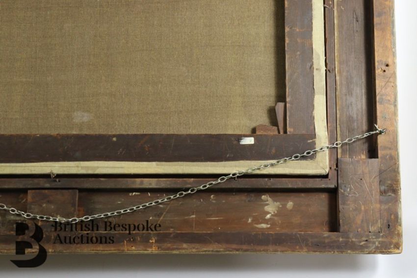 Condition report: the canvas has been subject to restoration and re-lined. The canvas is pierced to the head and body of one of the figures leaning against a tree. There also a vertical scratch to the centre of the painting. The measurement does not include the frame which is substantial.