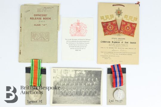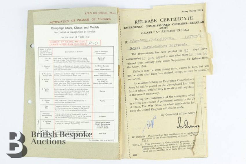 WWII medals awarded to Captain D.J  Osborne 237876 Royal Warwickshire Regiment, including the Defence medal and War medal 1939-45, together with a black and white Regimental photograph and a Officers Release Certificate.