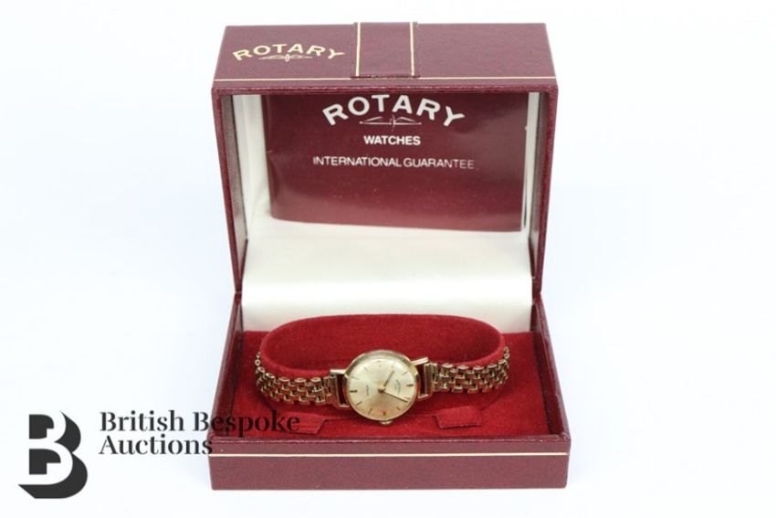 Lady's 9ct gold Rotary wrist watch, on 9ct gold strap. The watch having a silvered face with baton dial minute and hour markers, 18mm on a 9ct gold bracelet, approx 15 cms in length, 16.8 gms with movement.Condition report: watch has scratches to watch back and opening, face showing signs of discolouration, bracelet in fair condition, watch moving forward at time of testing however no guarantees are given.